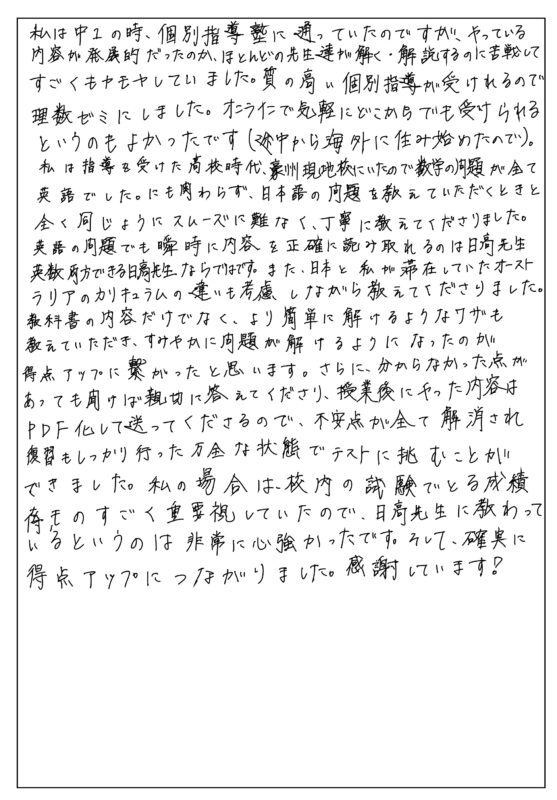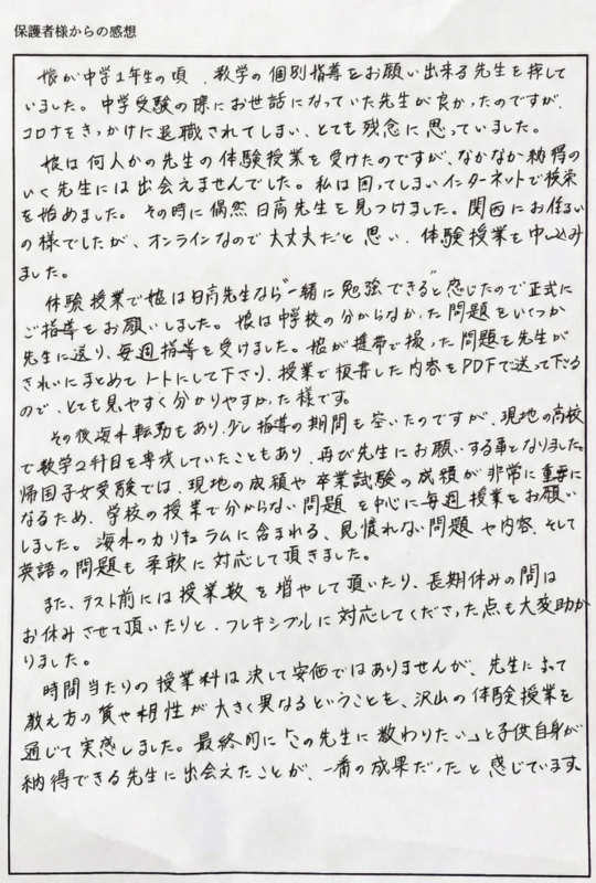 体験授業で娘は“日高先生なら一緒に勉強できる”と感じたので正式にご指導をお願いしました。娘は中学校の分からなかった問題をいくつか先生に送り、毎週指導を受けました。娘が携帯で撮った問題を先生がきれいにまとめてノートにして下さり、授業で板書した内容をPDFで送って下さるので、とても見やすく分かりやすかった様です。